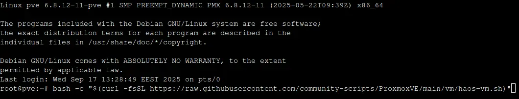 bash -c "$(curl -fsSL https://raw.githubusercontent.com/community-scripts/ProxmoxVE/main/vm/haos-vm.sh)"