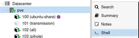 1. Відкриваемо Shell на Proxmox: натискаємо на назву вашого хоста Proxmox (в нашому прикладі це pve)
