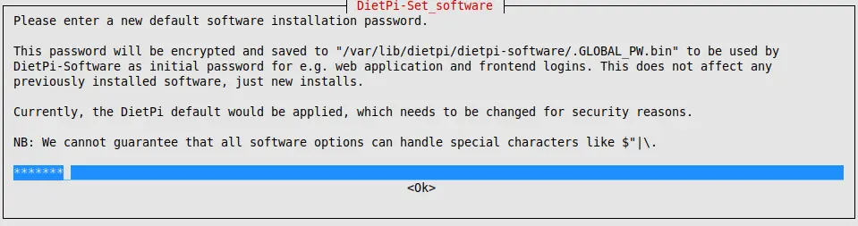 При завантаженні DietPi може запропонувати змінити пароль на вхід та встановлення програм, бажано змінити його відразу, обов'язково збережіть, або запам'ятайте пароль
