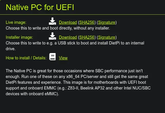 1. Скачайте DietPi (Native PC for UEFI, x86_64) Installer image та запишіть його на флешку, наприклад за допомогою Rufus