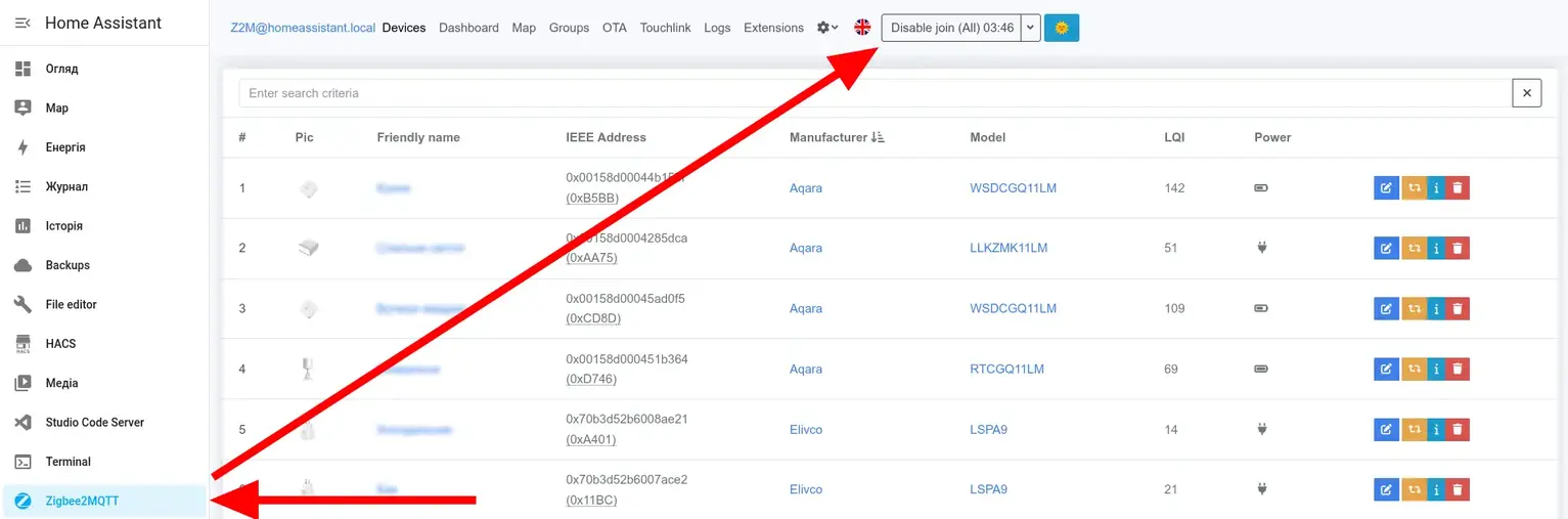 Натискаємо «Zigbee2MQTT» - «Allow join»