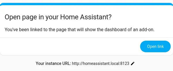 Коли з'явиться запит на підтвердження, чи хочете ви відкрити сторінку в Home Assistant, перевірте правильність URL-адреси вашого Home Assistant. В моєму випадку це http://homeassistant.local:8123